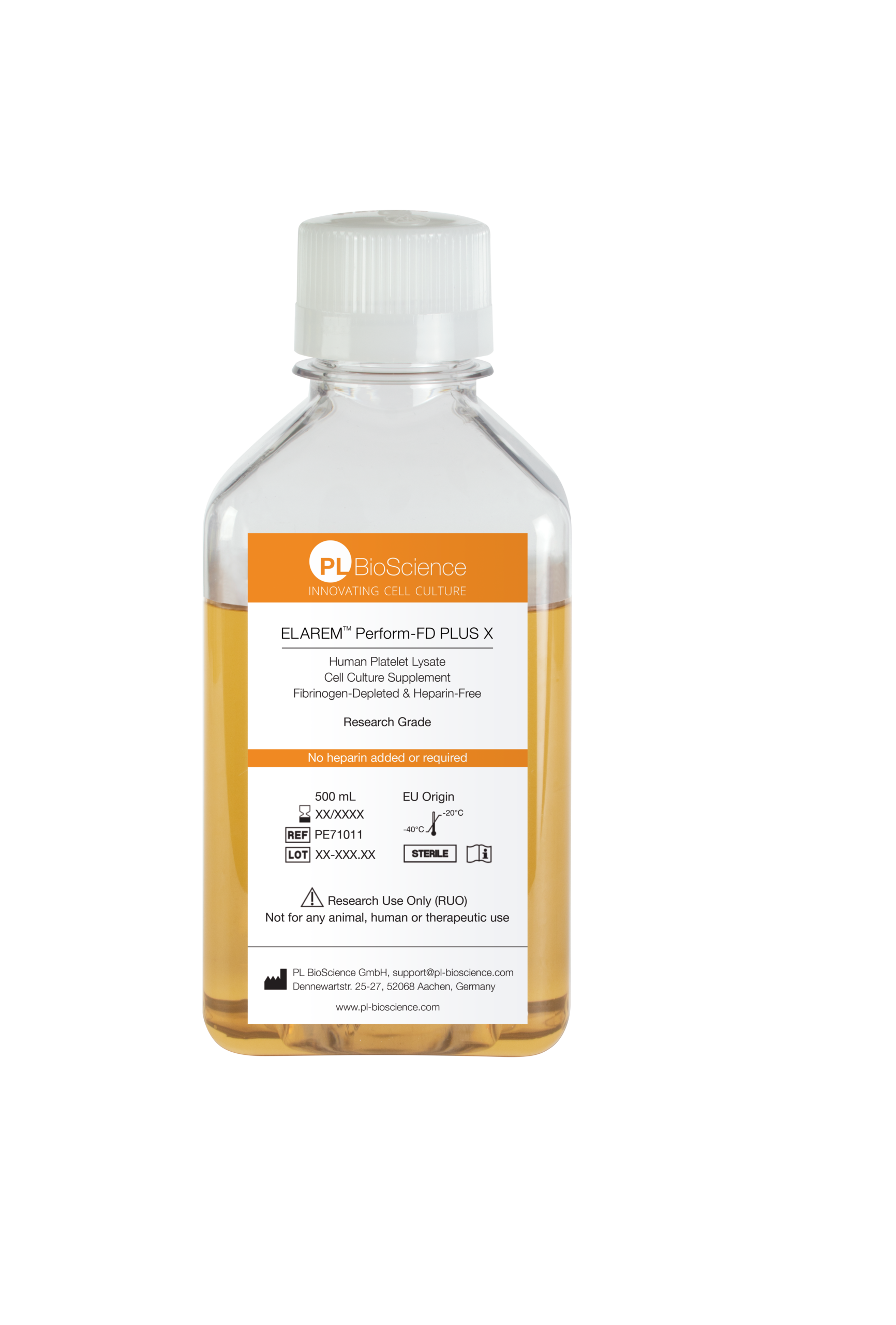 ELAREM™ Perform-FD PLUS X Research Grade is a fibrinogen-depleted and anticoagulant-free Human Platelet Lysate of EU origin. As a xeno-free and easy-to-use cell culture supplement, ELAREM™ Perform-FD PLUS X Research Grade supports the efficient and safe in vitro expansion of various primary cells and cell lines.